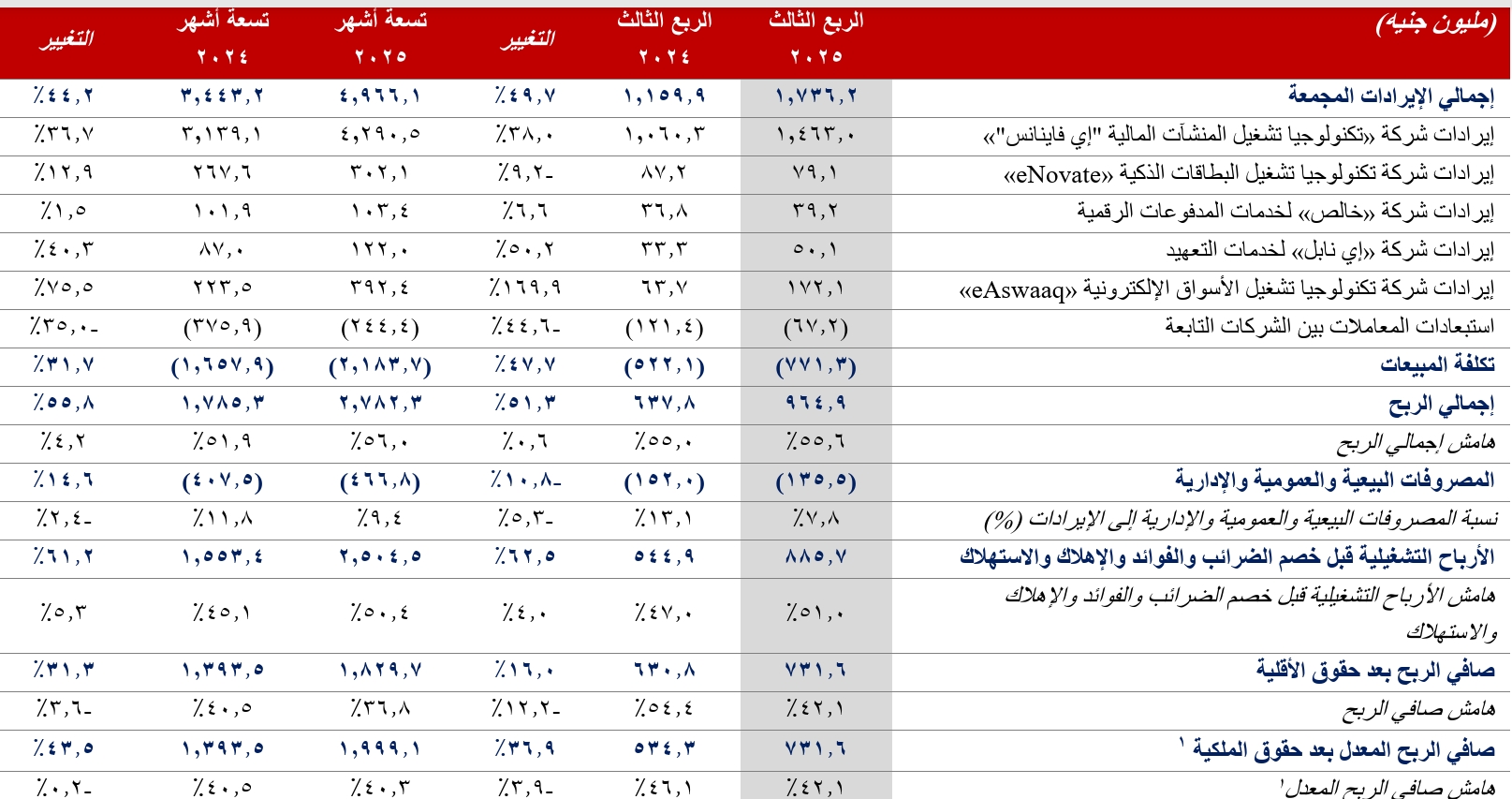 ارتفعت الإيرادات المجمعة بمعدل سنوي 44.2% إلى 5.0 مليار جنيه تقريبًا خلال أول تسعة أشهر من عام 2025، مدفوعة بالأداء القوي لجميع الشركات التابعة. وقد مثلت شركة تكنولوجيا تشغيل المنشآت المالية “إي فاينانس” المحرك الرئيسي لنمو إيرادات المجموعة خلال الفترة، بفضل ارتفاع إيرادات أغلب قطاعاتها التابعة، بالإضافة إلى المساهمة القوية من شركات «eAswaaq»، و«eNovate»، و«إي نابل» و«خالص».