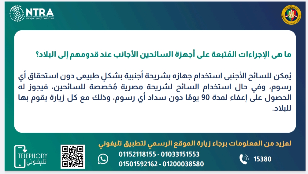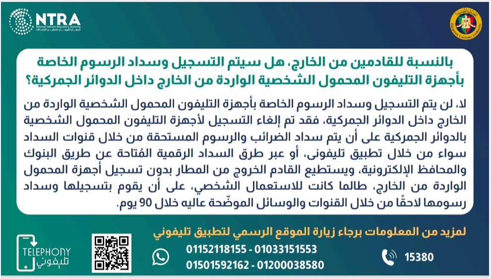 وأعلن الجهاز القومي أن اي شخص قادم من الخارج يمكنه الخروج من المطار بدون تسجيل أجهزة المحمول الواردة من الخارج، طالما كانت للاستعمال الشخصي على أن يقوم بتسجيلها وسداد رسومها لاحقًا من خلال القنوات والوسائل الموضحة عاليه خلال 90 يوم.