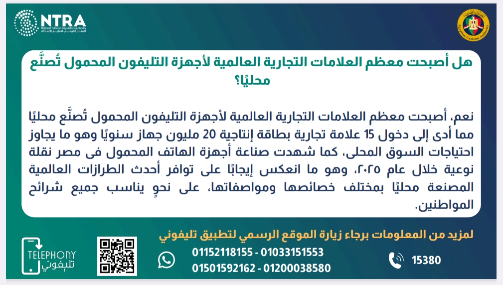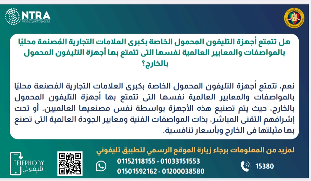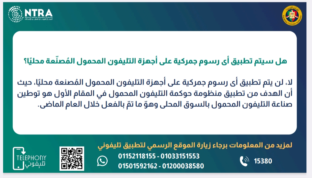 كشف الجهاز القومي لتنظيم الاتصالات عن وقف تسجيل وسداد الرسوم الخاصة بأجهزة الهاتف المحمول الشخصية الواردة من الخارج داخل الدوائر الجمركية، الخاصة بمنظومة حوكمة الهواتف المحمولة المستوردة لتطبيق تليفوني.