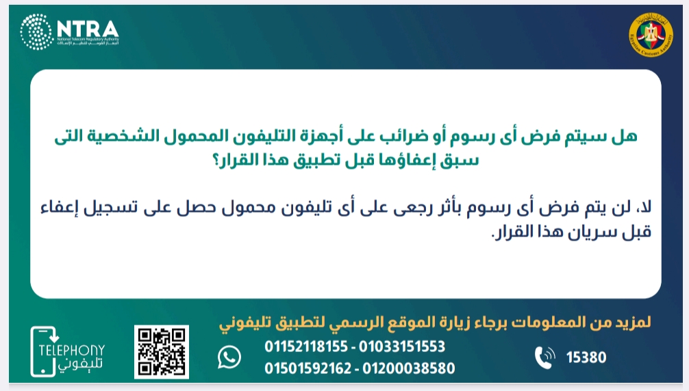 وتؤكد مصلحة الجمارك والجهاز القومي لتنظيم الاتصالات على عدم تطبيق هذه الضرائب والرسوم بأثر رجعى على الأجهزة التى تم إعفائها قبل بدء تطبيق هذا القرار، كما تحيط مصلحة الجمارك السادة القادمين من الخارج علماً بأنه تم إلغاء تسجيل أجهزة الهاتف المحمول الشخصية بالدوائر الجمركية لانتفاء الغرض منه وأن سداد الضرائب والرسوم المستحقة يتم من خلال قنوات السداد المبينة بعاليه.