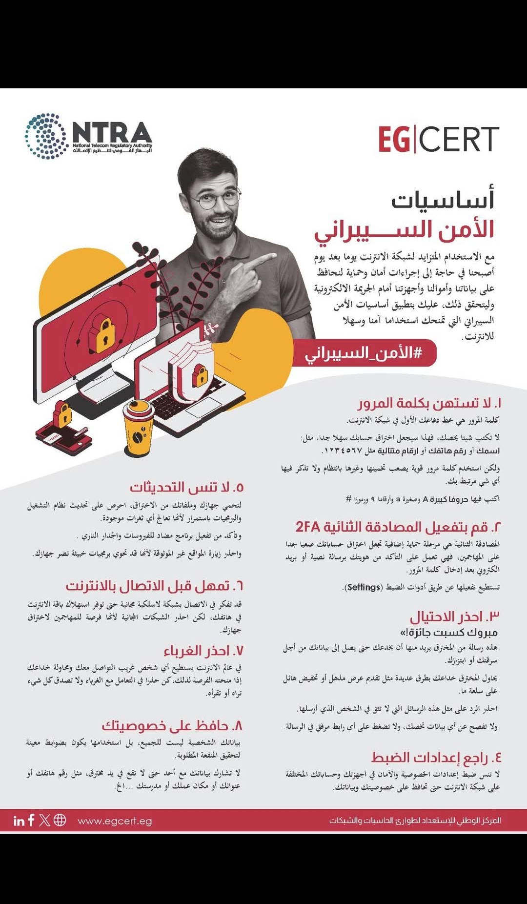 وحرصًا من المركز على رفع الوعي وتعزيز حماية المستخدمين، تنفيذا للاستراتيجية الوطنية للأمن السيبراني (2023-2027) التي تهدف الي رفع مستوي الوعي السيبراني لدي المواطنين ننصح باتباع ما يلي:
