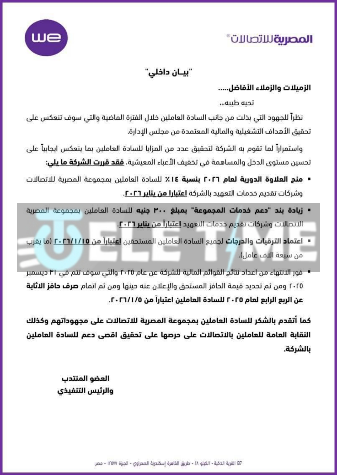 وحسب تفاعل نشرته شبكة تيلي تايم : سيتم زيادة بند دعم خدمات المجموعة بمبلغ 300 جنيه للسادة العاملين بمجموعة المصرية الاتصالات وشركات تقديم خدمات التعهيد اعتباراً من يناير 2026.