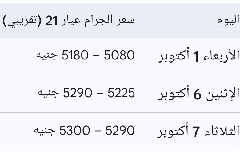 عيار الذهب الأكثر تداولاً، عيار 21، سجل ارتفاعات متتالية، ليتحول من مستويات قرب 5080 جنيهًا للجرام في بداية الأسبوع (الأربعاء 1 أكتوبر)، إلى أن لامس وتجاوز حاجز 5290 – 5300 جنيه للجرام في ختام تعاملات الأسبوع (الثلاثاء 7 أكتوبر)، أي بزيادة تجاوزت 200 جنيه في الجرام الواحد خلال فترة وجيزة.