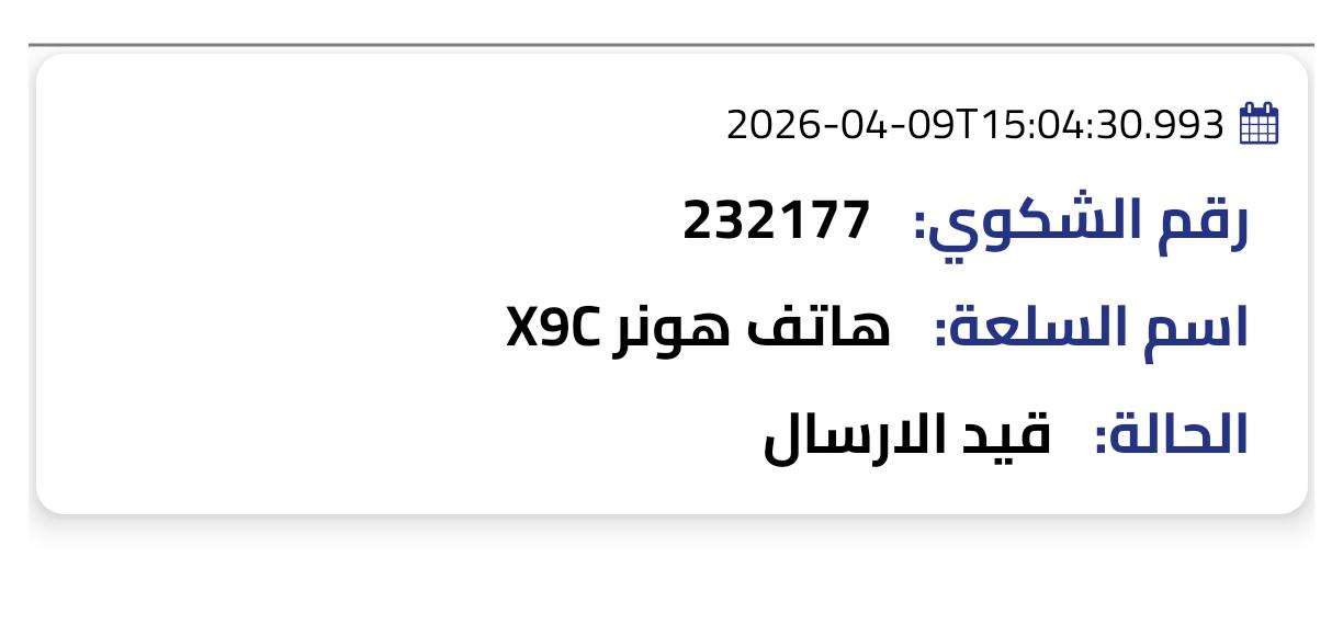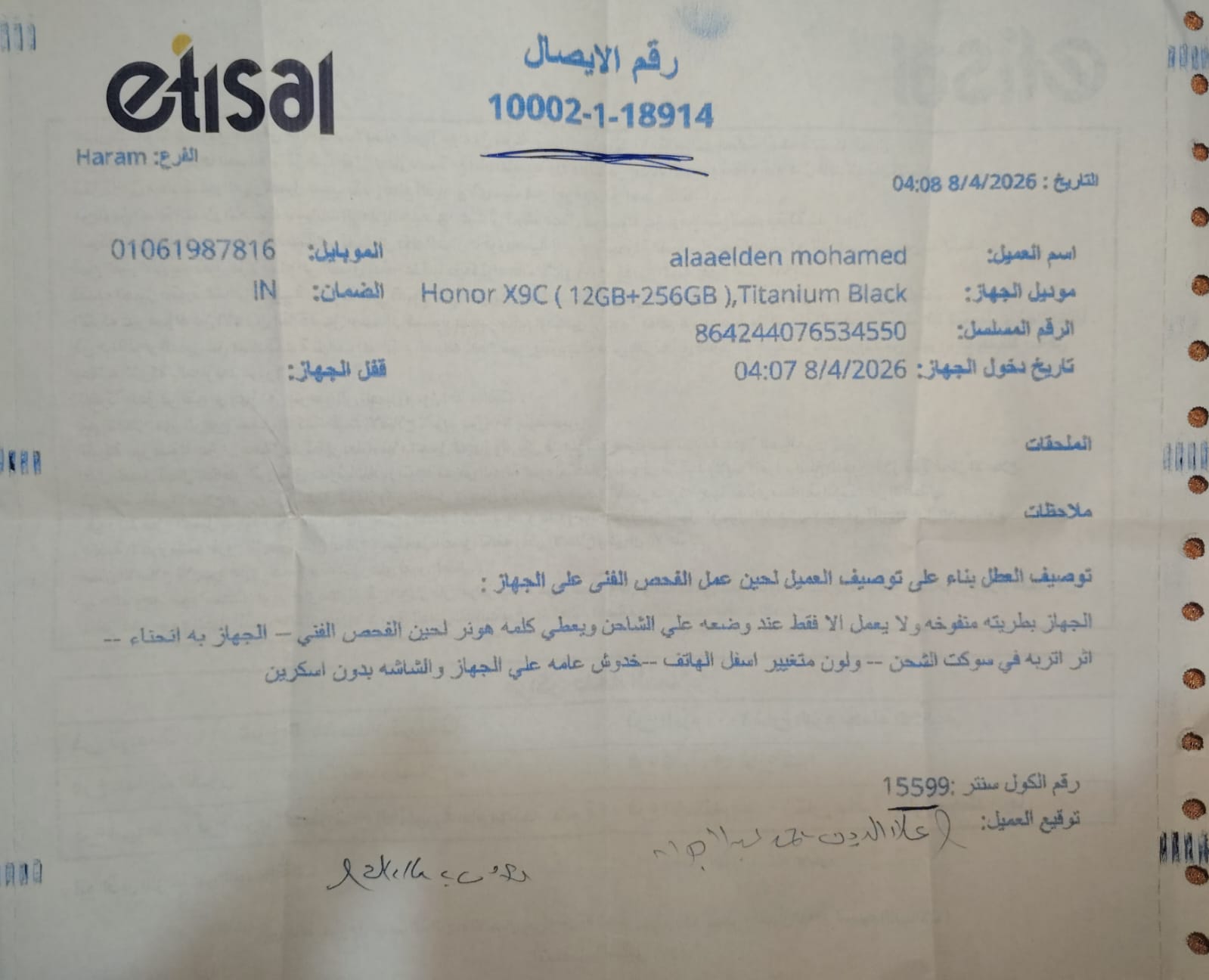ينشر ميجا نيوز شكوى تلقاها جهاز حماية المستهلك الخميس 9 ابريل 2026 بشأن انتفاخ بطارية هاتف هونر HONOR X9C .