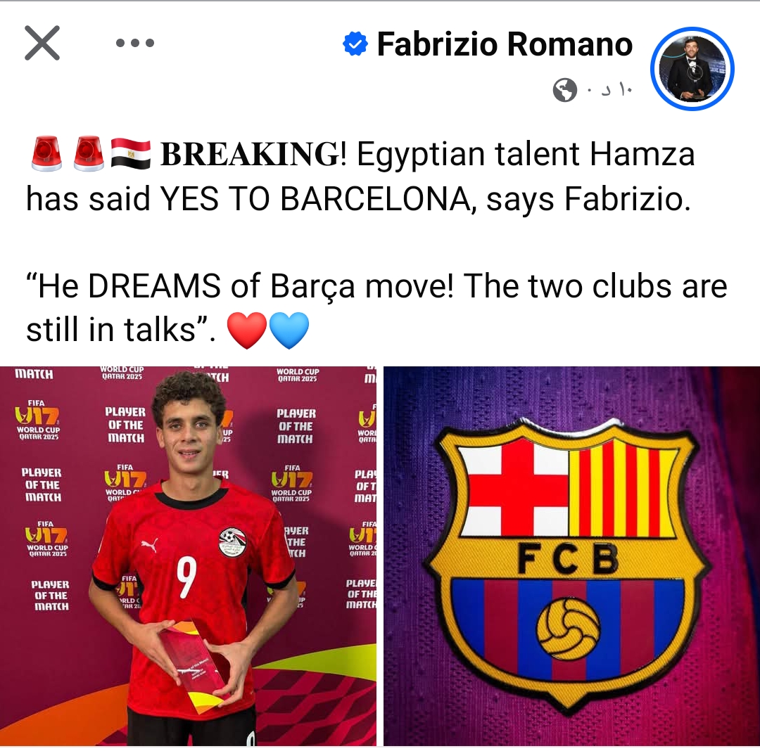 وأوضح رومانو عبر حساباته الرسمية أن اللاعب المصري الشاب لا يرى سوى “البلوجرانا” وجهة قادمة له، واصفاً الانتقال إلى قلعة “كامب نو” بأنه “حلم الطفولة” الذي يسعى لتحقيقه. وأكدت المصادر أن رغبة اللاعب القوية حسمت الجدل حول العروض الأخرى التي كانت تلاحقه مؤخراً.