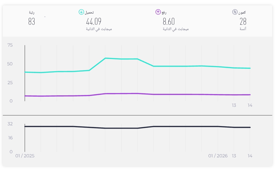 تقدم ترتيب مصر في تصنيف متوسط سرعة إنترنت المحمول «الداتا موبايل» نحو 9 مراكز بنهاية عام 2025 حيث جاء ترتيبها على مستوى العالم في المركز الـ 83 بنهاية العام الماضي 2025، مقارنة بالمرتبة الـ 92 بنهاية عام 2024.