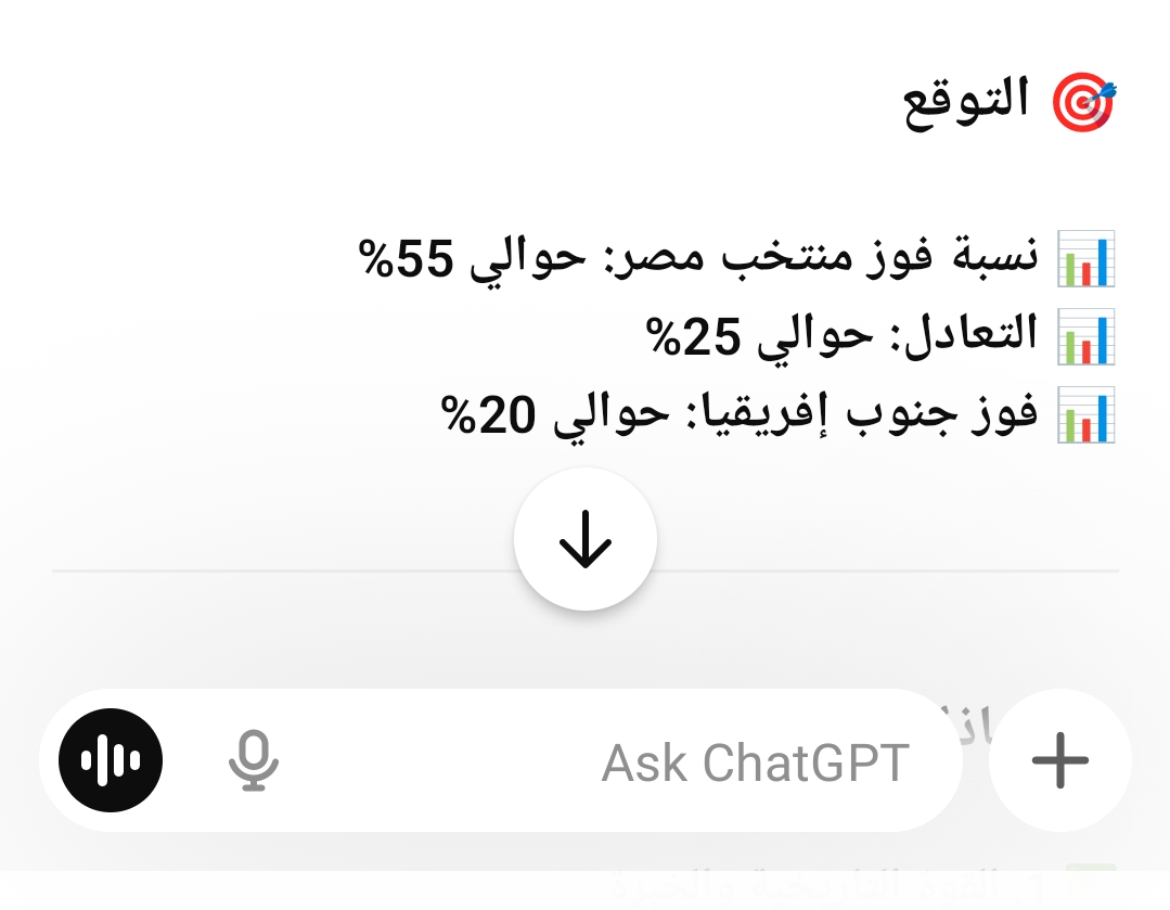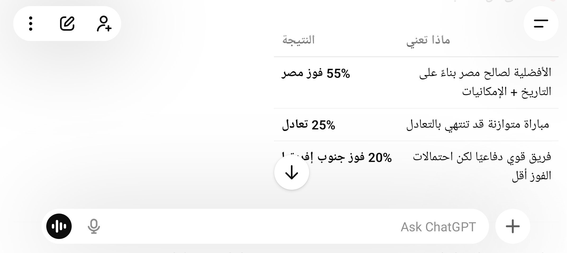 وتوقع شات جي بي تي Chatgpt أن تفوز مصر باللقاء بنسبة 55% وفوز جنوب أفريقيا بنسبة 20% بينما اعتقد أن انتهاء اللقاء بتعادل الفريقين تصل إلى 25%.