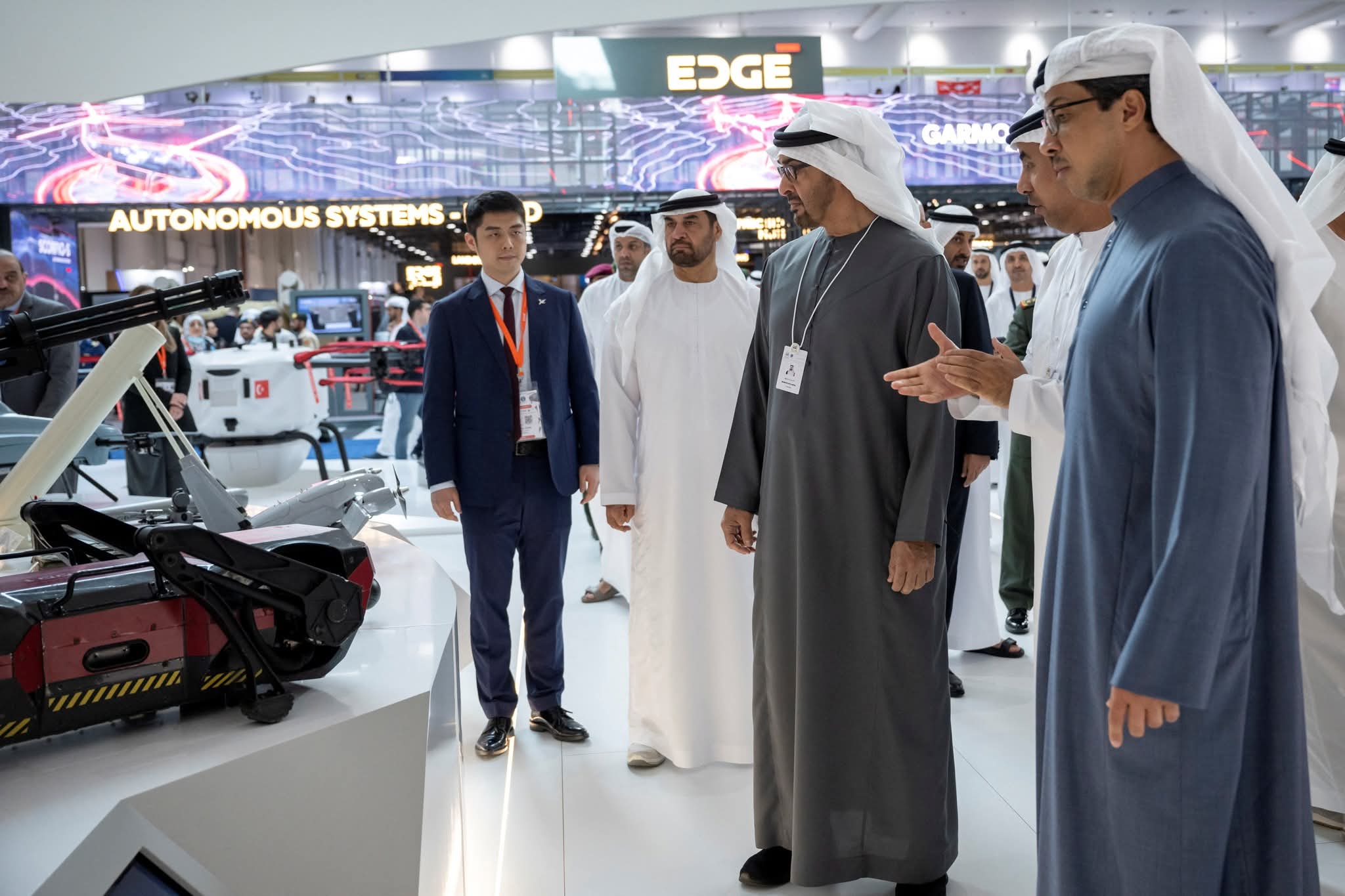 Sheikh Mohamed bin Zayed Al Nahyan, President of the United Arab Emirates tours the 2023 International Defence Exhibition and Conference (IDEX) with Sheikh Mansour bin Zayed Al Nahyan, UAE Deputy Prime Minister and Minister of the Presidential Court at Abu Dhabi National Exhibition Centre (ADNEC) in Abu Dhabi, United Arab Emirates, February 21, 2023. Hamad Al Kaabi/UAE Presidential Court/Handout via REUTERS.